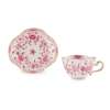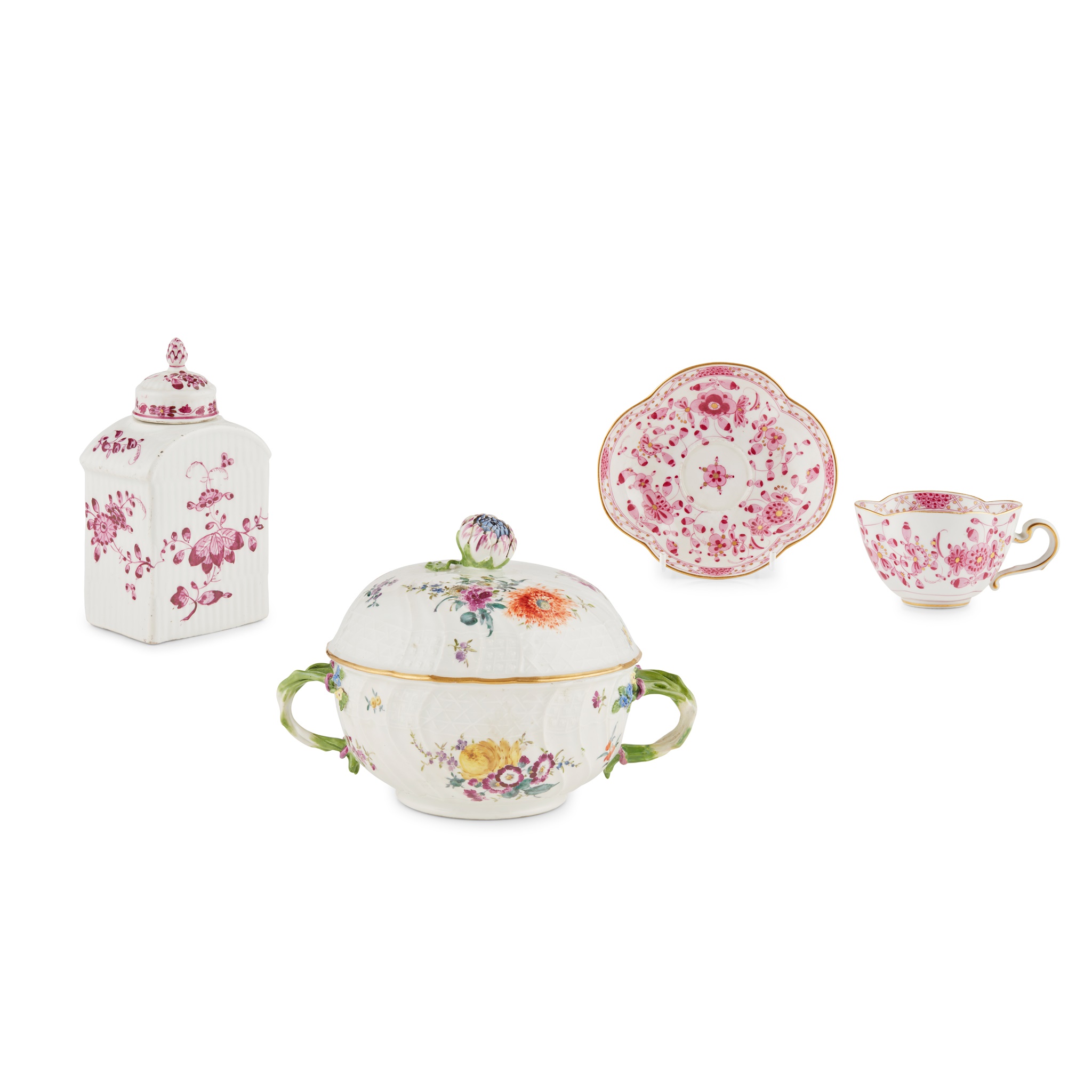 comprising an ecuelle and cover, of ozier-moulded form painted with deutsche Blumen, underglaze blue crossed swords, 20cm wide; a tea canister painted in puce with flowers and foliage, blue crossed swords and star, 13.5cm high; and a cup and saucer of quatrelobed form, painted in puce with flowers and foliage, underglaze blue crossed swords (3)