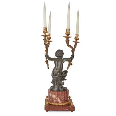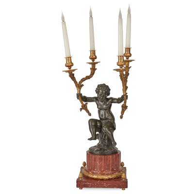 FRENCH LOUIS XV STYLE GILT AND PATINATED BRONZE AND MARBLE FIGURAL CANDELABRA