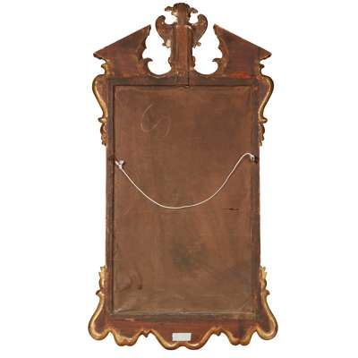 the shaped rectangular mirror plate in a leaf moulded frame with a broken arch pediment centred by a large foliate scroll and cartouche, the apron with a shell motif