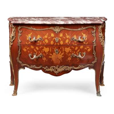 the serpentine breche violette marble top with a moulded edge above two long drawers with flower marquetry and enclosed by rococo gilt bronze mounts, raised on square cabriole legs outlined in gilt bronze and ending in sabots