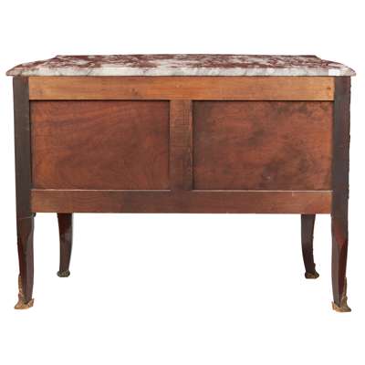 LOUIS XV STYLE KINGWOOD AND MARQUETRY MARBLE TOP COMMODE