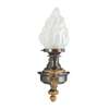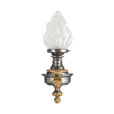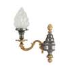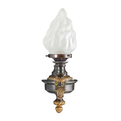 steel grey patina and polished bronze, the turned bodies with berry finials, the scrolling arms with harebell swags, the wide pans fitted for electricity, frosted glass flame shades (2)
