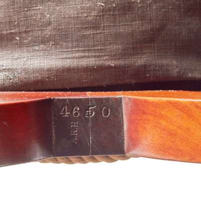 with shaped ladderbacks and turned finials above curved padded seats flanked by open arms continuing to shaped X-frame legs joined by a stretcher rail, each stamped with initials ARH and no. 4650 (2)