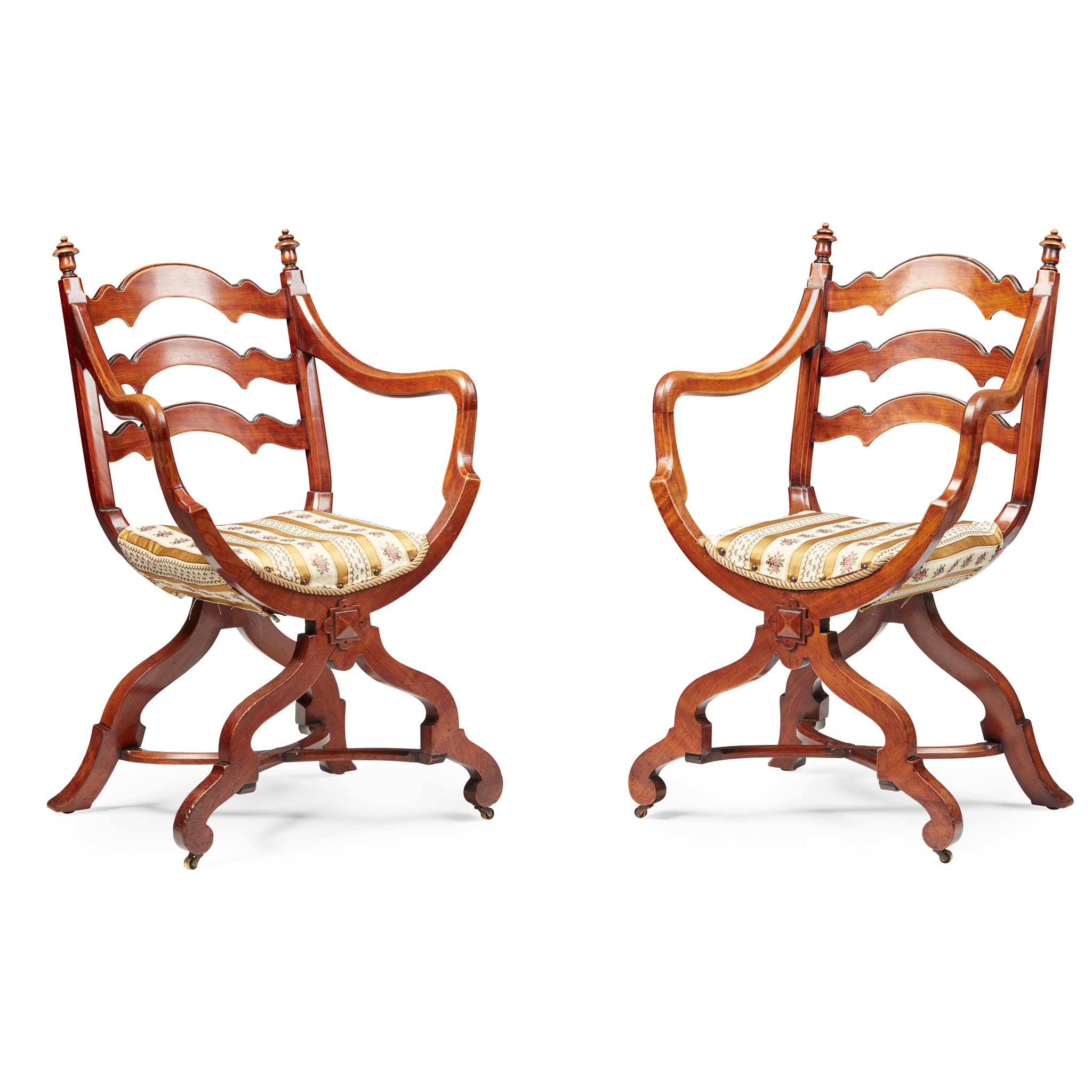 PAIR OF WALNUT X-FRAMED ARMCHAIRS