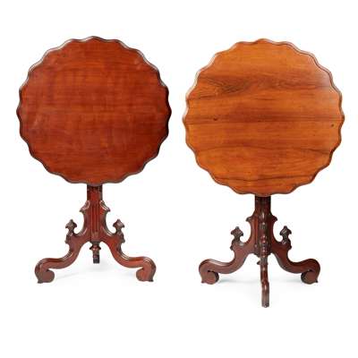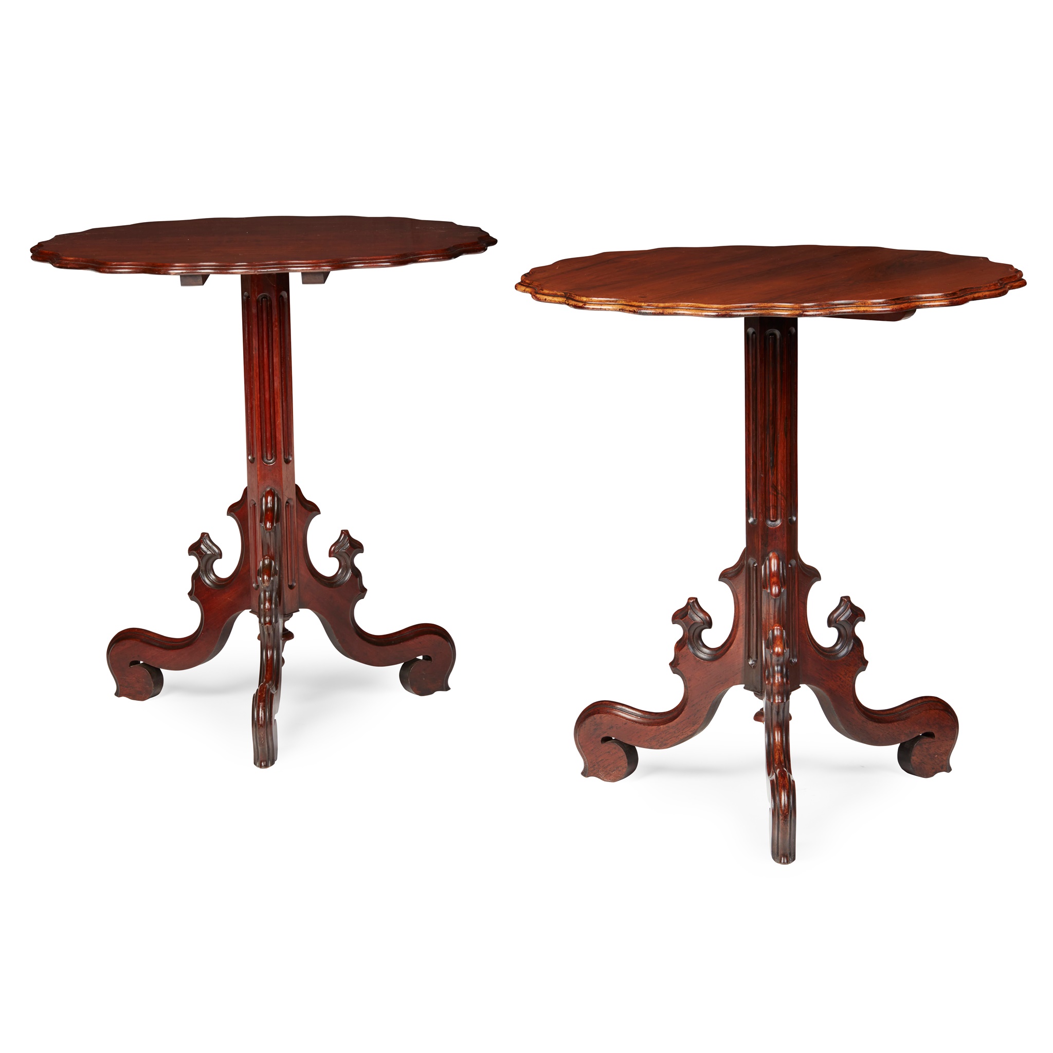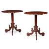 one in mahogany, the other rosewood, of matching design and size, the shaped tilt tops with a moulded edge on fluted columns and scrolling tripod bases (2)