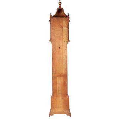 the breakarch hood with pagoda top surmounted by three turned giltwood urn finials, enclosing an 11 inch brass dial with silvered chapter ring, Roman numerals and Arabic five minute markers, pierced brass spandrels subsidiary second dial with date aperture below, the arch with ‘Strike/Silent’ dial, pierced steel hands, the trunk with breakarch door, on a panelled plinth base with bracket feet, decorated throughout in the Chinoiserie style with gilt figures in a temple landscape on a red ground, the twin-train movement with anchor escapement, striking a bell