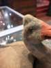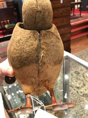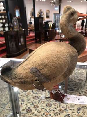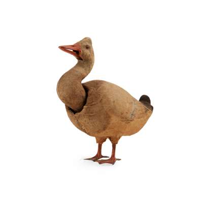 the papier mache body covered in baize painted as feathers, the weighted head with glass eyes and moving beak, raised on painted metal feet, having a key-wound clockwork mechanism