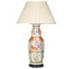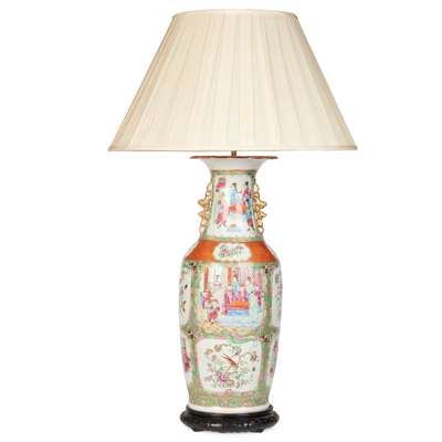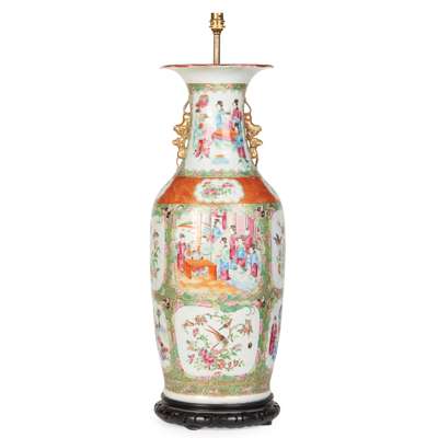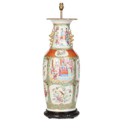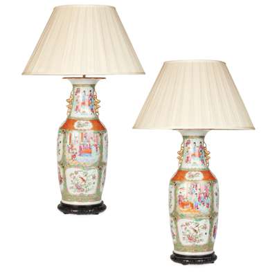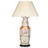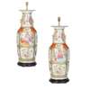 decorated with reserves of court figures, flowers, and birds, with an iron red band to the shoulder, all enhanced with gilding, now drilled and mounted as lamps with cream box pleated silk shades (2)