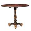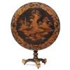 the circular tilt top decorated with a landscape view with pavilions, pagoda and gardens within a dragon border, on a turned column support with a triform base carved with dragon head feet with castors