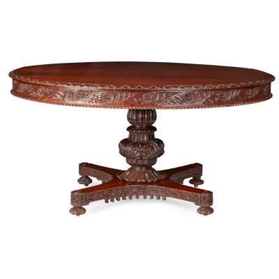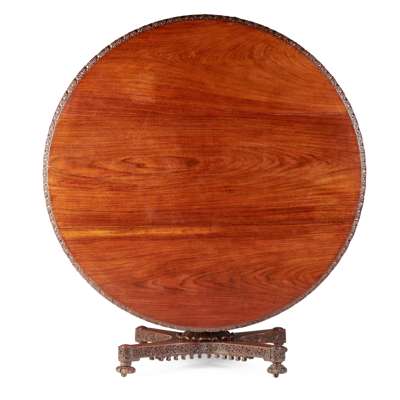 the circular tilt top with a foliate carved edge above a scrolling leaf and flowerhead frieze with gadrooned banding, raised on a lotus and acanthus carved baluster column and quadripartite base with bun feet and ceramic castors