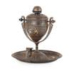 the circular base inlaid with a border of hippocamps within scrolling foliate arabesques, the urn shaped oil reservoir on a wishbone gimble and decorated with mythical beasts, with a single scroll handle