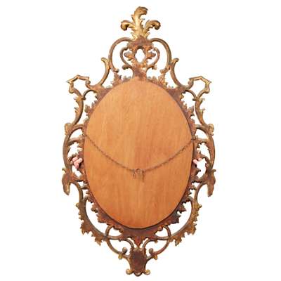 the oval mirror plate in a gadrooned frame enclosed by C and foliate scrolls surmounted by a carved foliate cresting