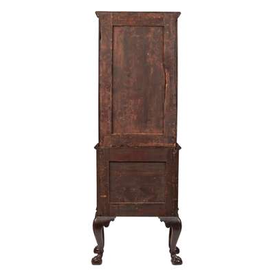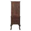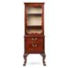 the moulded cornice above a glazed door enclosing adjustable shelves, the base with two graduated drawers flanked by quarter columns and raised on leaf carved cabriole legs ending in claw and ball feet; with Hamptons London trade label to the drawer
