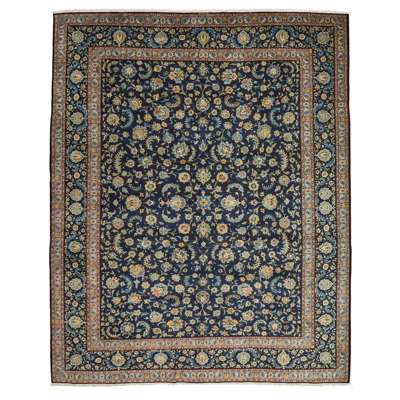 the indigo field with allover palmette and scrolling vine pattern, within indigo border