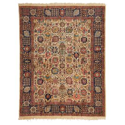 the cream field with allover palmette and scrolling vine pattern, within indigo border