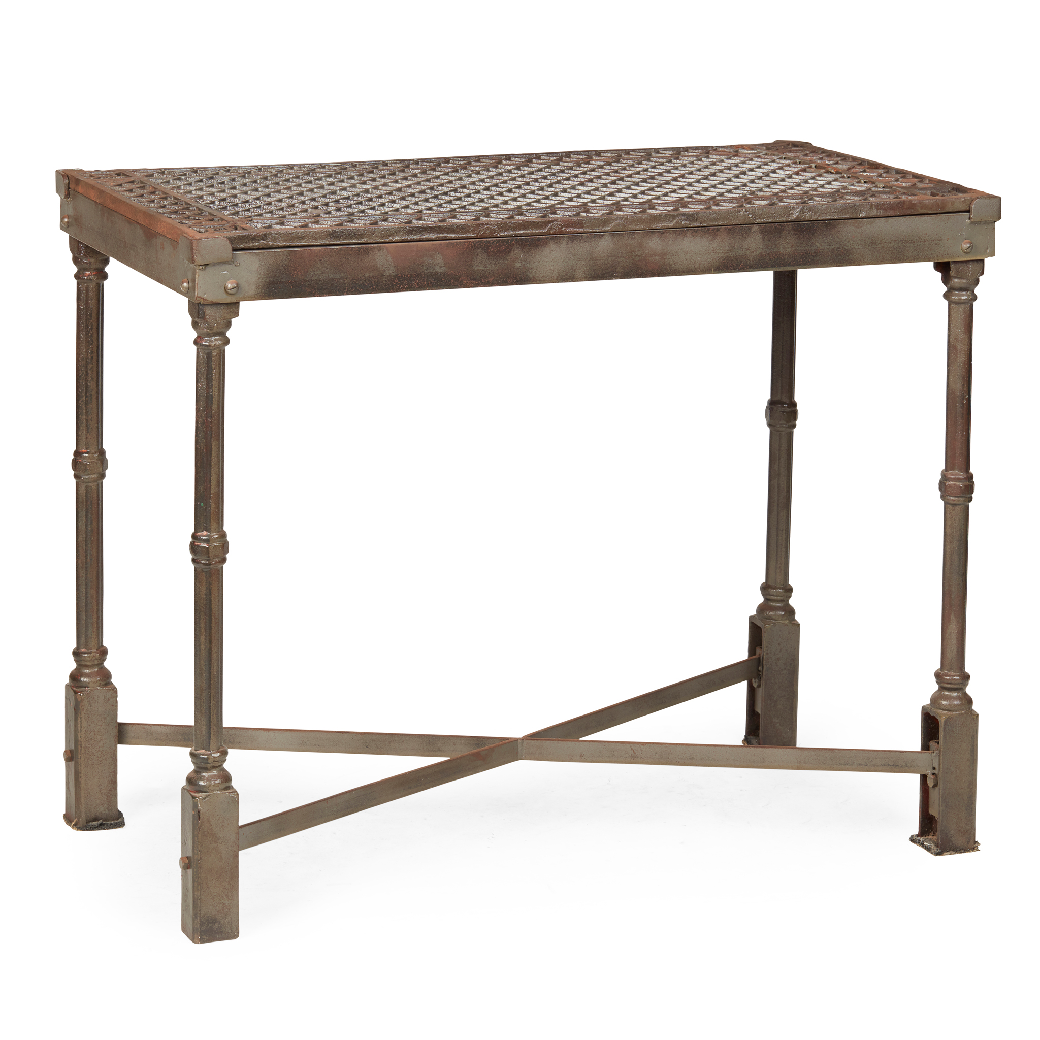 the rectangular open lattice tops on gothic style cluster column legs joined by an X stretcher