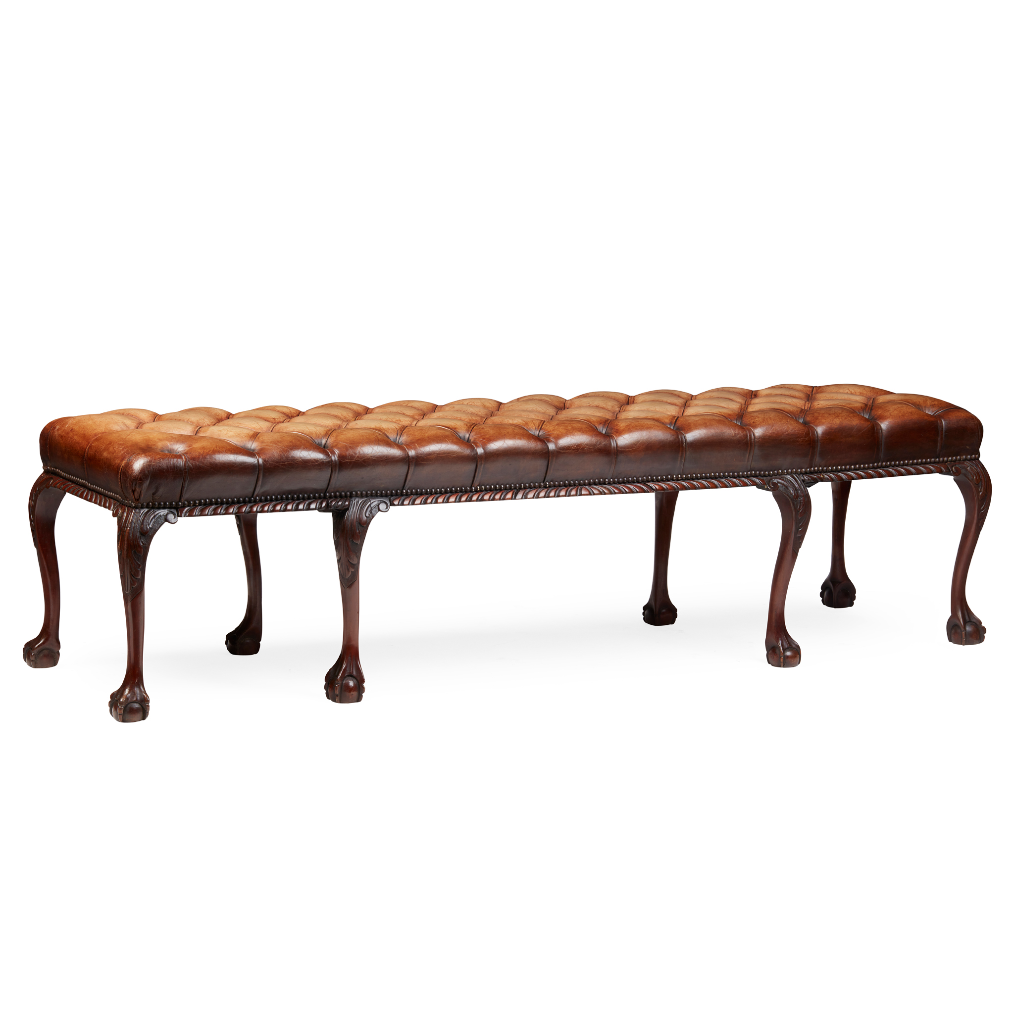 the long padded seat in brown buttoned leather with close nail trim, above a gadrooned seat rail and raised on eight acanthus carved cabriole legs ending in carved claw and ball feet