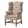 the tall back with an arched top rail and serpentine ears above a loose cushion seat and scrolled arms, raised on channel moulded straight legs joined by stretchers; in cream floral upholstery