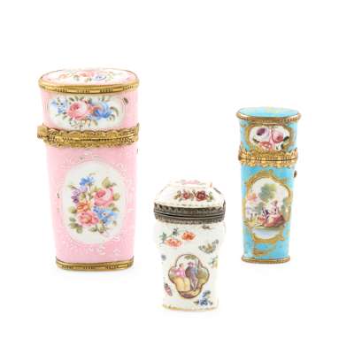 the first English enamel in pink with white cartouches painted with flowers, the gilt metal hinged lid opening to reveal manicure and sewing tools; the second English enamel in Sevres blue with cartouches painted with flowers, a hunting scene and a courting couple, the gilt metal hinged lid opening to reveal sewing tools, 8cm high, 3cm wide, 2cm deep; the third in white porcelain in the Meissen style, painted with courting couples in quatrefoil cartouches to the front and back, surrounded by flowers and colourful insects, with a further scene of a couple in a landscape to the interior of the lid, 6cm high, 3.5cm wide, 2.2cm deep (3)