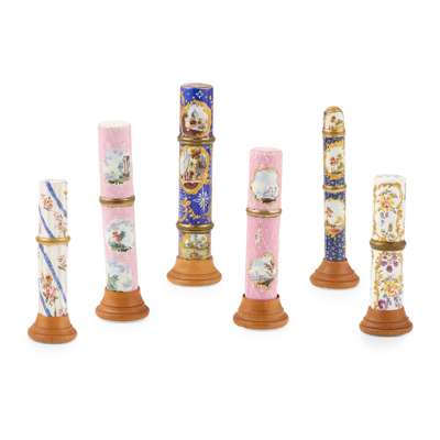 to include one with landscape and architectural scenes within white enamel scroll borders on a pink ground with white enamel diaper and flower decoration, with gilt metal mounts, 13cm long; one with similar decoration and a gilt metal mount on the base, 10.8cm long; one with architectural and pastoral scenes with gilt rocaille scroll borders, on a blue ground with white enamel diaper designs, containing a screw-on scent bottle, with gilt metal mounts, 15cm long; one with a landscape on a dark blue ground, containing a screw-on thimble, 13.1cm long; one of fluted form with sprays of flowers spaced with patterned blue ribbon, with engraved yellow metal mounts, 11.8cm long; and one with floral sprays within gilt rocaille scroll borders and gilt metal mounts, 12.1cm long; all with wood stands (6)