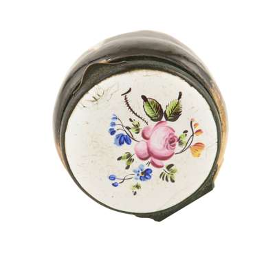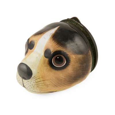 modelled as a dog's head, with a gilt brass mount and hinge, the cover decorated with a flower sprig