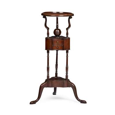 the moulded ring top above a centre tier with two short drawers and surmounted by a globular powder container, all raised and divided by turned supports and a tripod base with pad feet