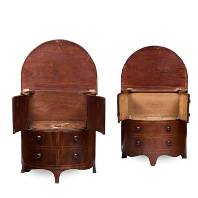 MATCHED PAIR OF GEORGE III MAHOGANY DEMILUNE BEDSIDE COMMODES, IN THE MANNER OF GILLOWS