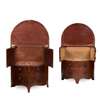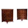 the hinged demilune tops above pairs of cupboard doors with dummy drawer fronts, concealing fitted commode interiors, above wavy aprons and raised on French bracket feet (2)