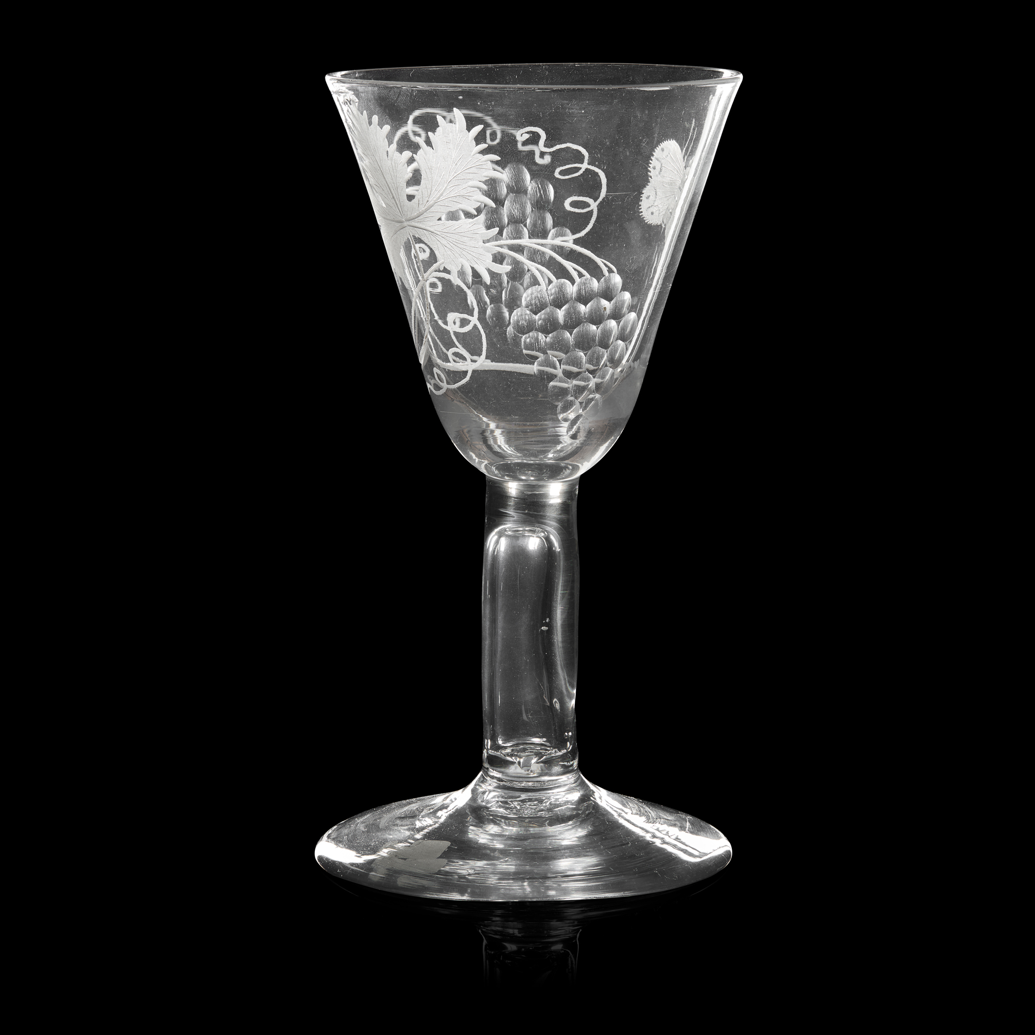 the round funnel bowl engraved with fruiting vines and a butterfly/moth, raised on a cylindrical stem enclosing a long tear, on a conical spreading foot