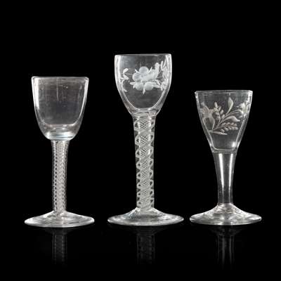 including an airtwist glass with an elongated round funnel bowl on a stem with two knops, 20.1cm high; an airtwist glass with a drawn trumpet bowl on a plain stem, 15.5cm high; an engraved opaque twist glass, the bowl engraved with a bird and a flower on a leafy branch, 14.9cm high; a further opaque twist stem glass, 12.6cm high; an ale glass with a drawn trumpet bowl, engraved with hops and barley on a plain stem with a folded foot, 15.2cm high; and a small plain stem glass engraved with a bird and a flower, 11.5cm high (6)