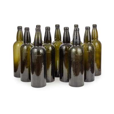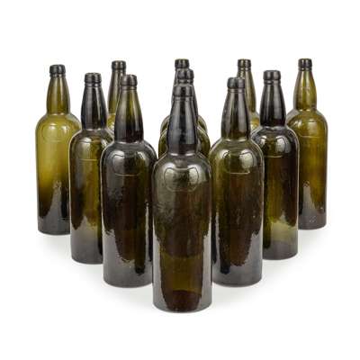 olive green, of typical cylindrical form, each with a moulded label to the front inscribed ‘SANDEMANS PORT’ (11)