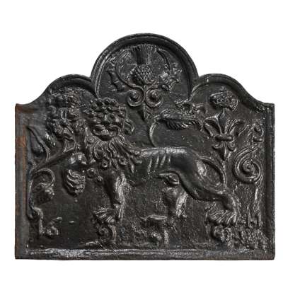Note: This fireback may have been made in reference to the Scottish origin of the Stuart dynasty showing the allegiance between Scotland, England and France. Other exampes exist with dates ranging from 1641 to 1649, the year of Charles I's execution. A similar example dated 1649 is in the collection of the Victoria & Albert Museum, London (acc. no. 492-1901) (see Jeremy Hodgkinson, British Cast-Iron Firebacks of the 16th and 17th Centuries, (Worth, Crawley: Hodgersbooks, 2010), p. 178, no. 258).