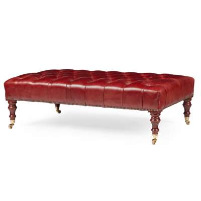 the oxblood red buttoned leather with close nail trim, raised on turned mahogany legs with brass caps and castors