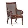 with a caned back, enclosed arms, and seat, the frame carved with scrolls with acanthus and berry motifs, with a leather seat cushion and part padded arms, raised on reeded and tapered legs ending in large brass caps and castors