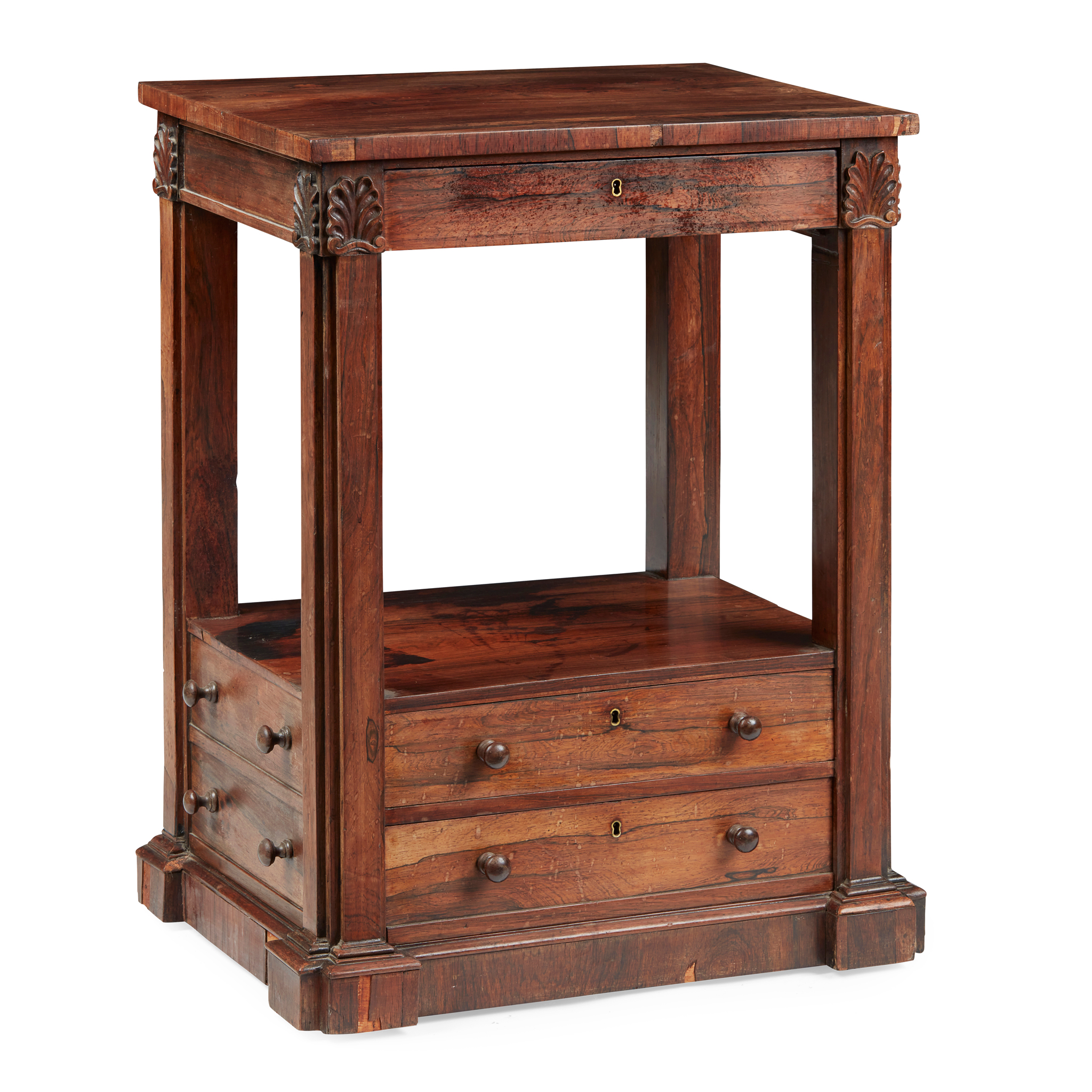 the rectangular top over frieze drawers and raised on square column supports carved with pilasters headed by anthemion, the base fitted with two long drawers and dummy drawers, on a moulded plinth base
