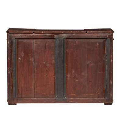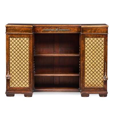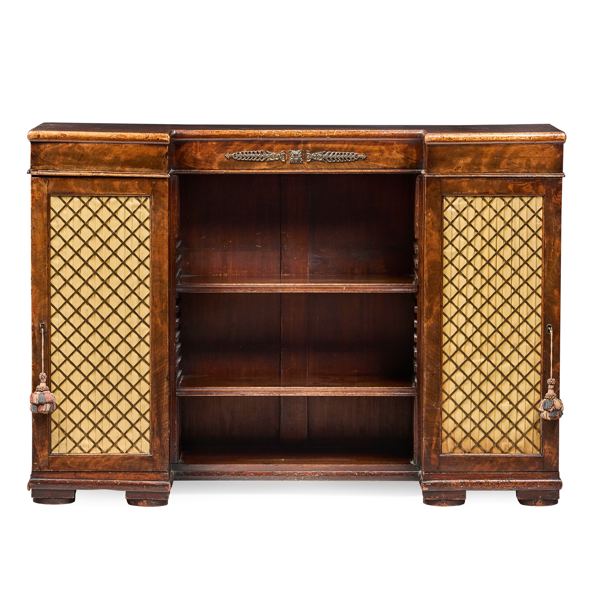 with a central open bookcase with adjustable shelves flanked by cupboards with brass grille insert doors lined with pleated yellow silk, on short block feet