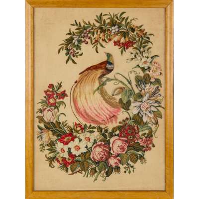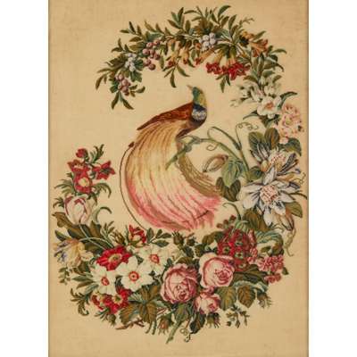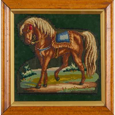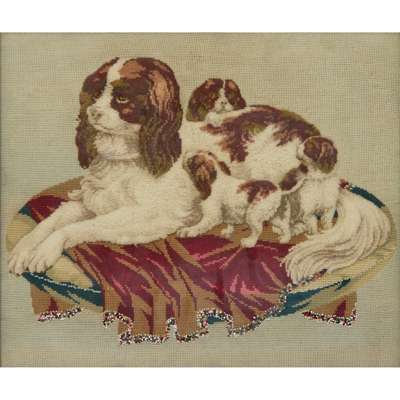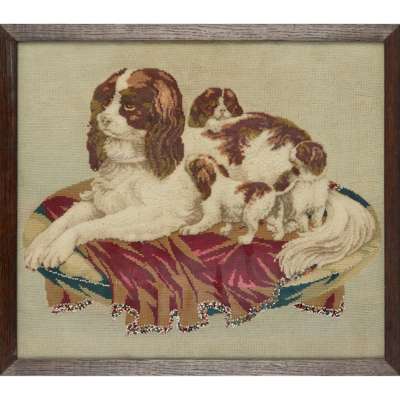 the first depicting a cavalier spaniel with puppies on a cushion, worked in turkey rug and tent stitches with beadwork details; the second depicting a saddled roan horse, worked in turkey rug and tent stitches, the horse with a glass button eye, mounted on a green velvet backing; the third a large format canvas depicting a bird-of-paradise with a glass button eye perched on a flower garland, worked in turkey rug and tent stitches; all framed (3)