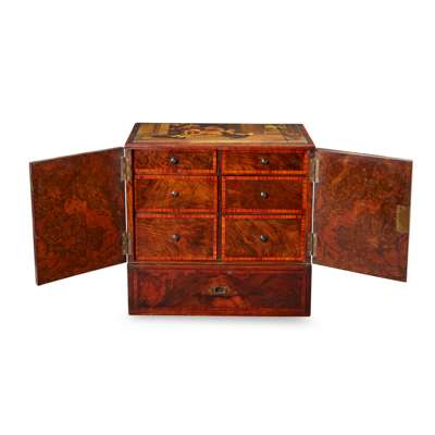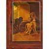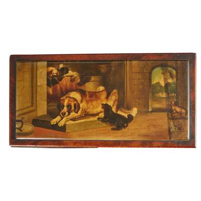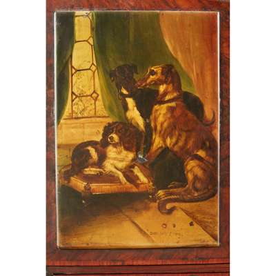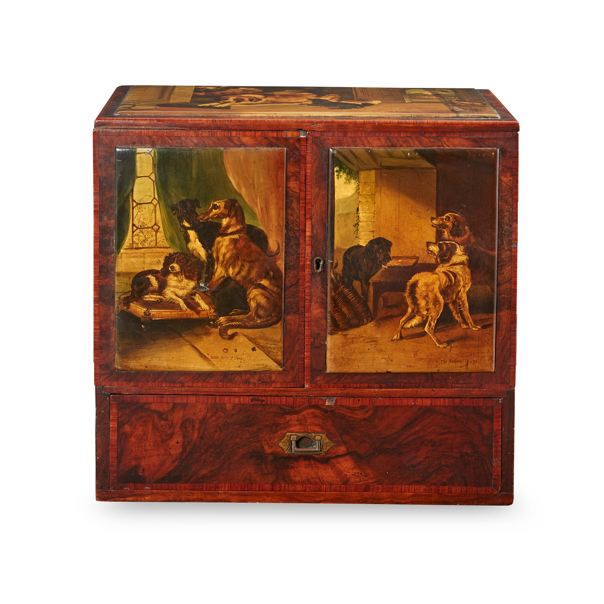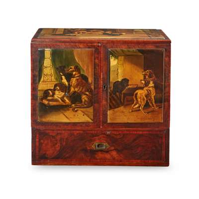 with a pair of banded doors enclosing six crossbanded short drawers, above a long base drawer, the top painted with a St. Bernard and spaniels in a courtyard and titled ‘The Sentinels’, the doors with an interior view of a spaniel with two lurchers, titled ‘Dash, Hector, & Hero’, the other door painted with three working dogs in an outbuilding, titled ‘The Keeper’s Dogs'