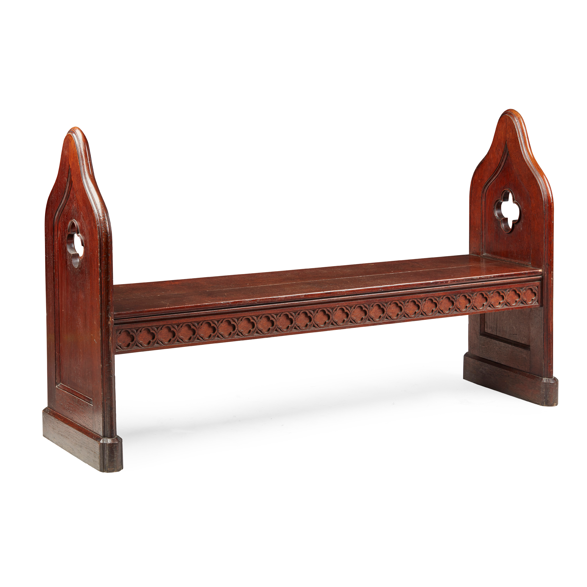 the arched panel ends with quatrefoil cut-outs and plinth bases, supporting a plank seat with a blind fret carved seat rail
