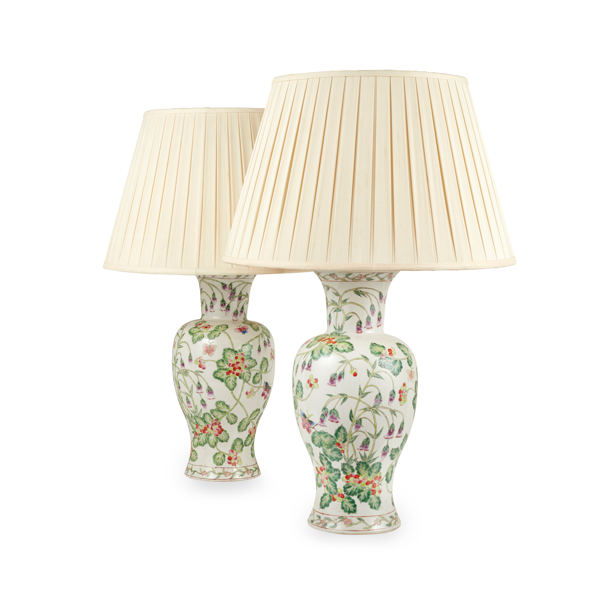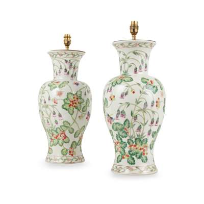 mounted as lamps, of baluster form, decorated with scrolling foliage and flowers, the foot rim with a band of peaches on leafy branches, fitted for electricity, unmarked (2)