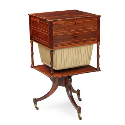 LATE GEORGE III ROSEWOOD AND BRASS INLAID WORK TABLE Y