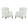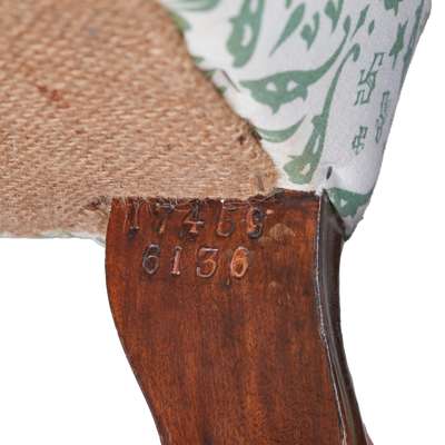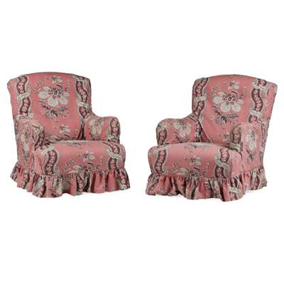 with slightly arched button backs and scrolled arms over stuff-over seats, raised on turned front supports with brass caps and castors, stamped ‘I 7459/6136’ to rear legs; upholstered in Howard & Sons signature monogram print, with floral print mulberry coloured slipcovers (2)