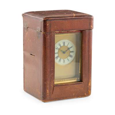 the cream enamel chapter ring with black Roman numerals inside a gilt mask, in an Anglaise Riche gilt bronze case with dentine friezes, the top, Corinthian columns and base with cream and pale blue floral Champlevé enamel, with bevelled glass panels, enamelled angled handle, the twin train brass movement with a platform lever escapement and striking on a coiled steel gong, the backplate stamped ‘Made in France’; in a glazed Moroccan leather case