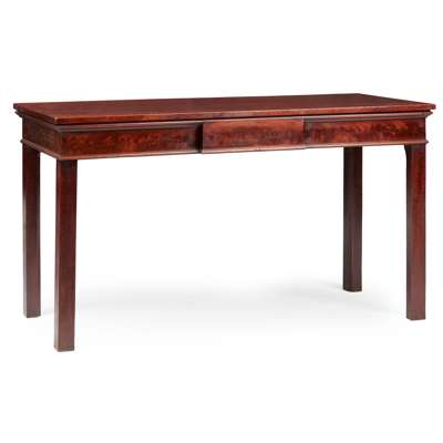the rectangular top above a plain frieze with central entablature, raised on square section legs