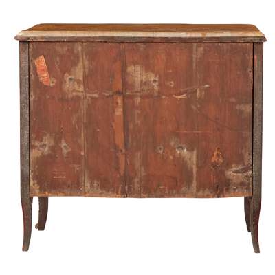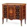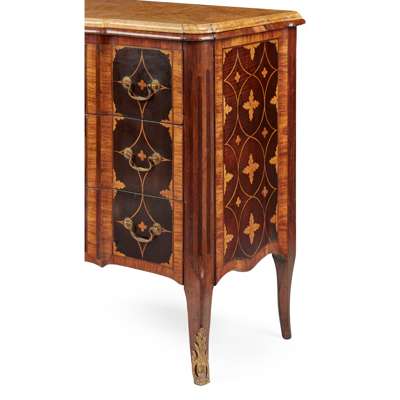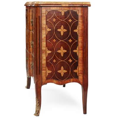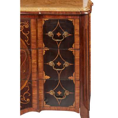 the shaped Siena marble top with a moulded edge over three long drawers with original brass handles and inlaid with a central oval reserve with a neoclassical urn within laurel leaf borders and scrolling foliate motifs, flanked by large scale diaper pattern inlay marked with foliate motifs, the crossbanded sides with matching inlay, raised on cabriole legs with gilt bronze sabots