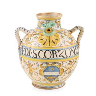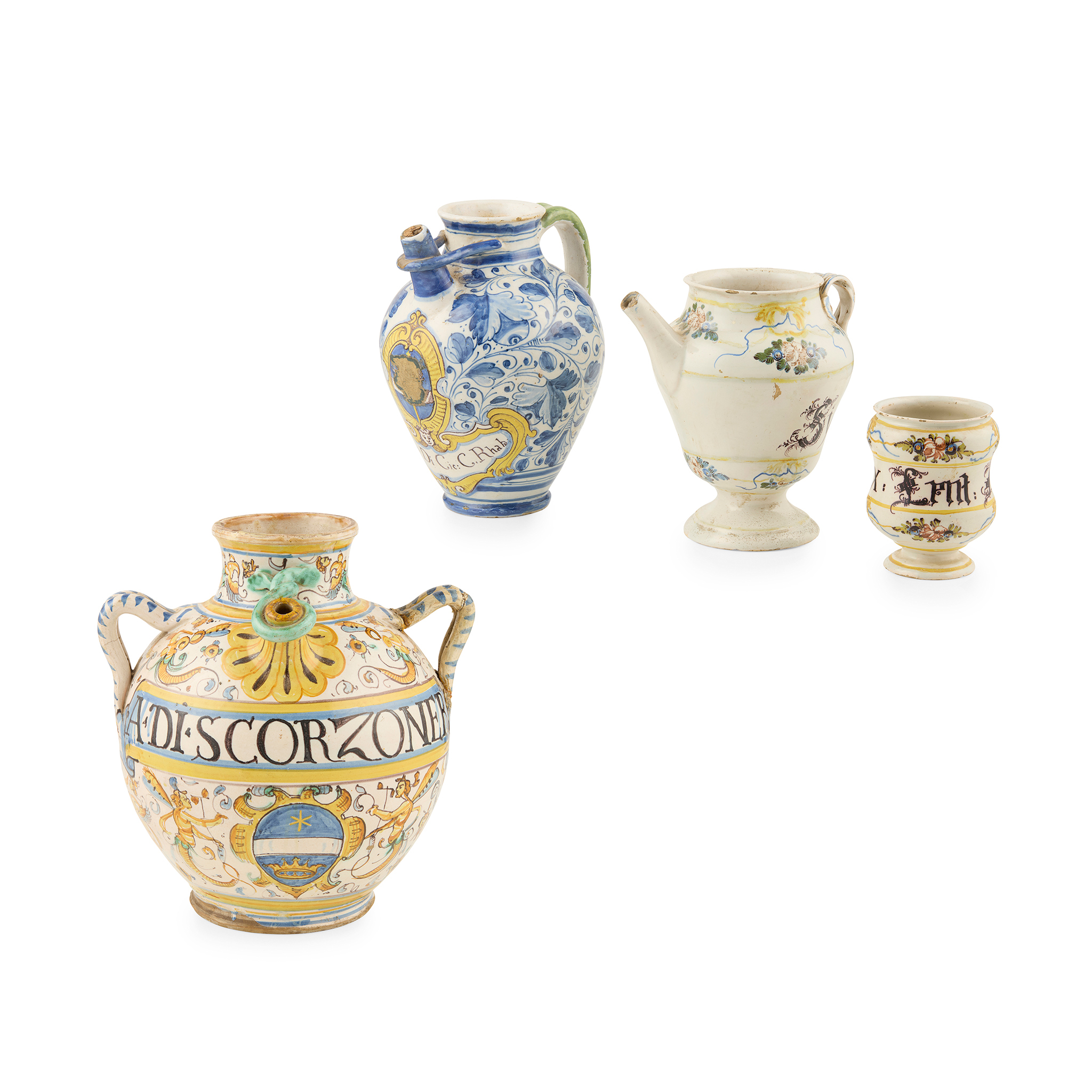 one of ovoid form with twin strap handles, the body with a scrolled banner inscribed ‘A. DI. SCORZONER’, above a coat of arms bearing a star, a white band and a crown within a cartouche, the ground with figural, scrolling and foliate motifs, the reverse undecorated, 29cm high; the other with one strap handle to the reverse, the spout above an obscured coat of arms within a cartouche, with a banner inscribed ‘Sirop: Di Cic: C. Rhab’, the ground decorated with blue scrolling foliage throughout, 24.5cm high; together with a FRENCH FAIENCE WET DRUG JAR with an inscribed band and floral decoration on a cream ground, 20.5cm high, and a small FRENCH FAIENCE DRUG JAR of waisted footed form with an inscribed banner and similar floral decoration, 12cm high (4)