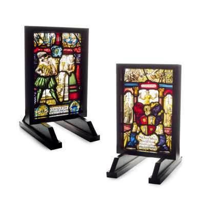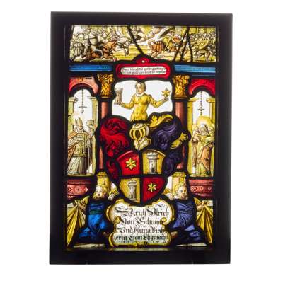 the first a ‘Willkommscheibe’, depicting a mercenary holding a long gun over his shoulder and presented with a chalice by his wife, with smaller scenes of a dinner party above, the figures identified as Heinrich Ott Von Güderberth and his wife, dated 1607; the other centred by a heraldic shield beneath the figure of a man holding a castle turret and a star, flanked by figures of St Ulrich and St Anna, with a scene of the battle of Lechfeld (910) above, with dedication below to Ulrich Ulrich Von Schwyz and his wife Anna Birchlerin, dated 1615; both mounted in modern wood frames with trestle bases (2)