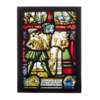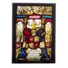 The second panel is a so-called Willkommscheibe, or welcome panel, which were usually commissioned by the family themselves to celebrate the safe return of the husband from war. The central image of these panels is always the husband shown with a weapon, in this case a musket, and the wife handing him a welcome drink in a goblet. The scenes above are unique to each panel, in this case showing a group of men around a table welcoming back their friend after his service in the war, and the wife serving them a jug, followed by a fool in his typical regalia. The bottom part of this glass panel seems to have been cut off, but it still shows the heraldry of the family, their names and what may have been the sign of the guild of stone masons.