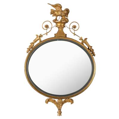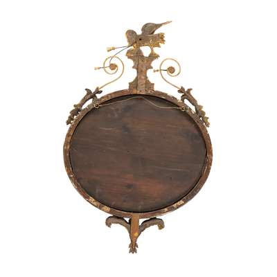 the oval mirror plate in an ebonised slip and moulded frame surmounted by an eagle and plinth with chains to acanthus scrolls, with a pendant Prince of Wales plumes below