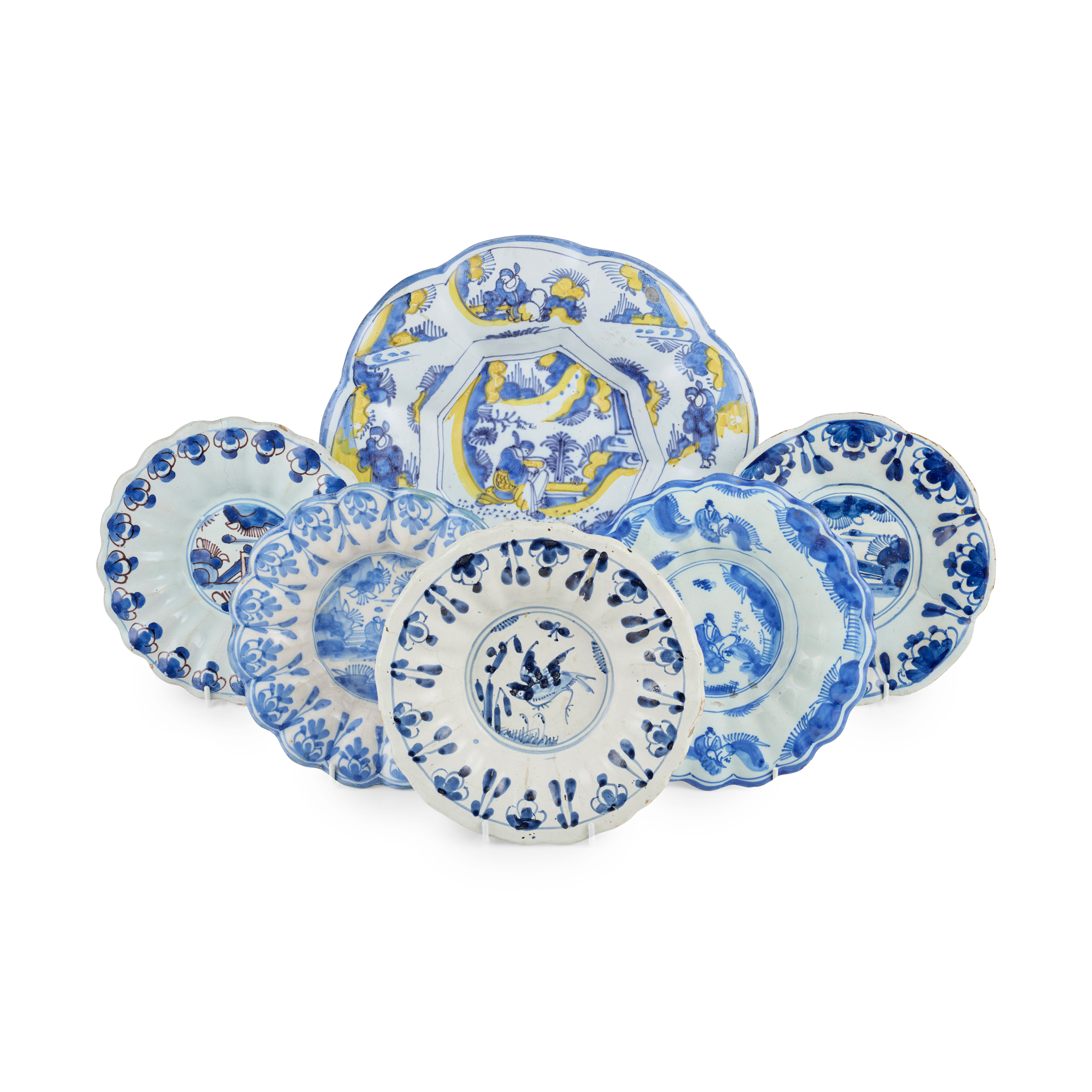 all of lobed, fluted form, enamelled in blue with decoration such as garden scenes, a bird and figure in landscape designs; also including a larger dish with underglaze blue and overglaze yellow enamel decoration showing figures and landscape decoration (6)